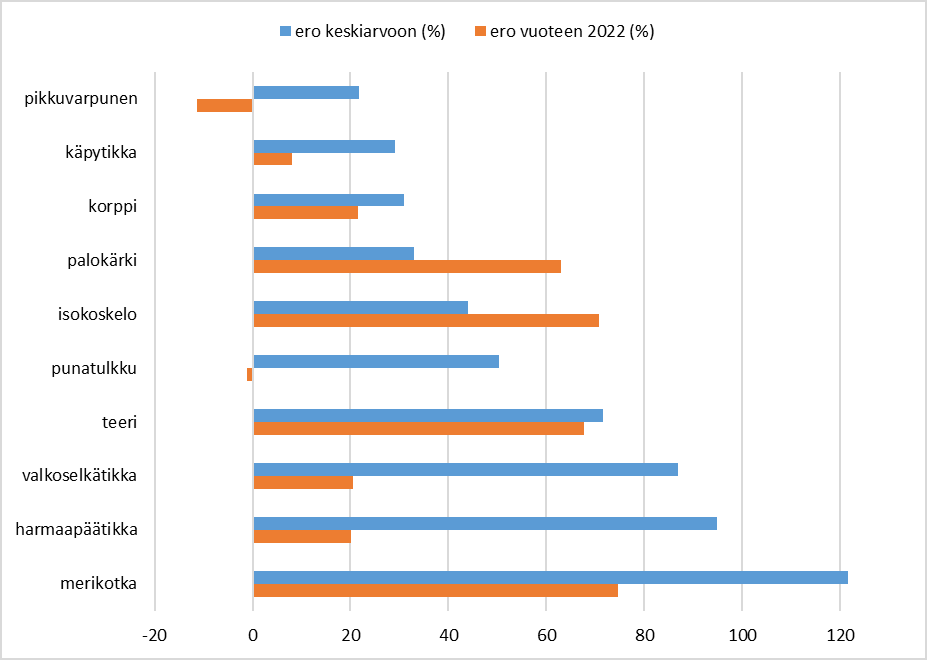 | LAJI | YKSILÖITÄ | YKSILÖITÄ/PIHA | ERO VUOTEEN 2022 (%) | ERO KESKIARVOON 2006–2022 (%) | KANNANMUUTOS (%) |