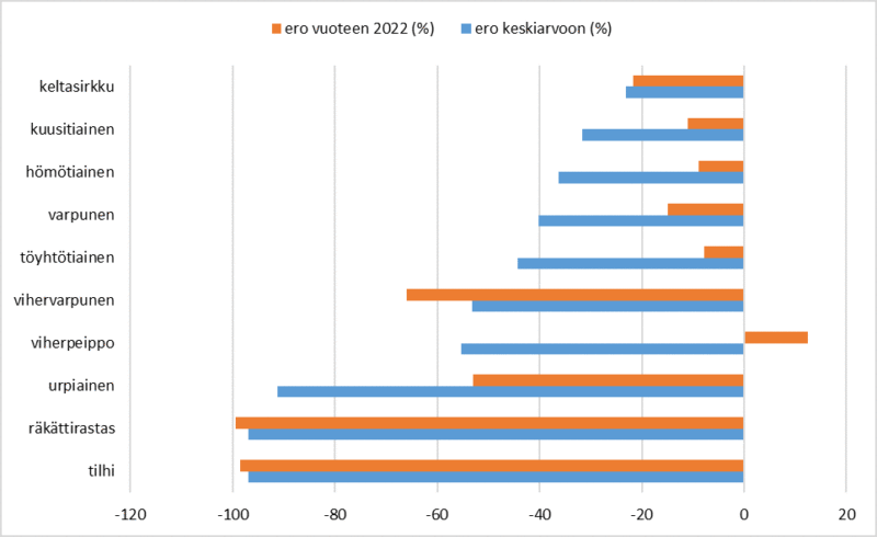 Pihabongauksessa 2023 vähissä olleita lajeja. Kuvassa on esitetty lajien runsauden (yksilöä/piha) ero vuosien 2006–2022 keskiarvoon sekä vuoteen 2022.