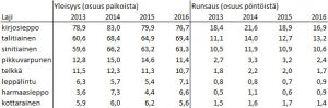 Pöntöissä havaittiin pesivänä yhteensä 34 eri lintulajia. Yleisimmät pöntöissä pesivät lintumme ovat kirjosieppo, talitiainen ja sinitiainen. Pönttöbongauksen 2016 tulokset viidentoista runsaimman lajin osalta löydät tästä taulukosta.