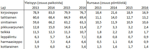 Kirjosieppojen määrä laski jo toisena vuonna peräkkäin, pudotusta edellisvuodesta oli noin 10 prosenttia. Tulos on varsin odotettu kahden huonon pesintäkesän jälkeen. Sen sijaan sinitiaisen pesintöjen määrä pysyi viimevuotisella tasolla ja talitiaisella jopa kasvoi hieman.