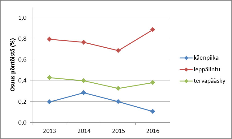 Leppälintuja havaittiin vuonna 2016 paljon ja tervapääskyjä viime vuotta paremmin, mutta käenpiikoja niukasti.