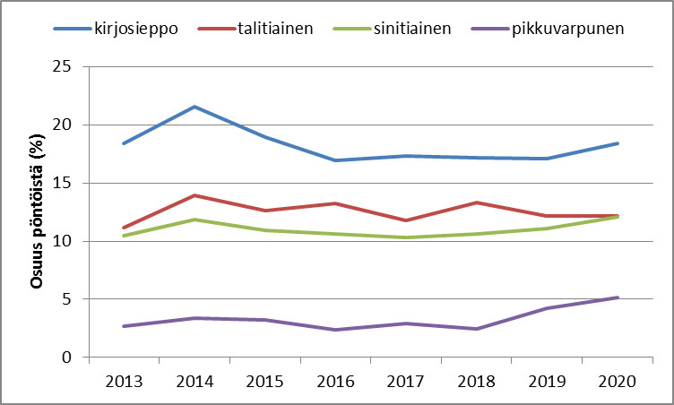 Kirjosiepon, tali- ja sinitiaisen sekä pikkuvarpusen runsaus (lajin asuttamien pönttöjen osuus kaikista pöntöistä) Pönttöbongauksessa vuosina 2013–2020.