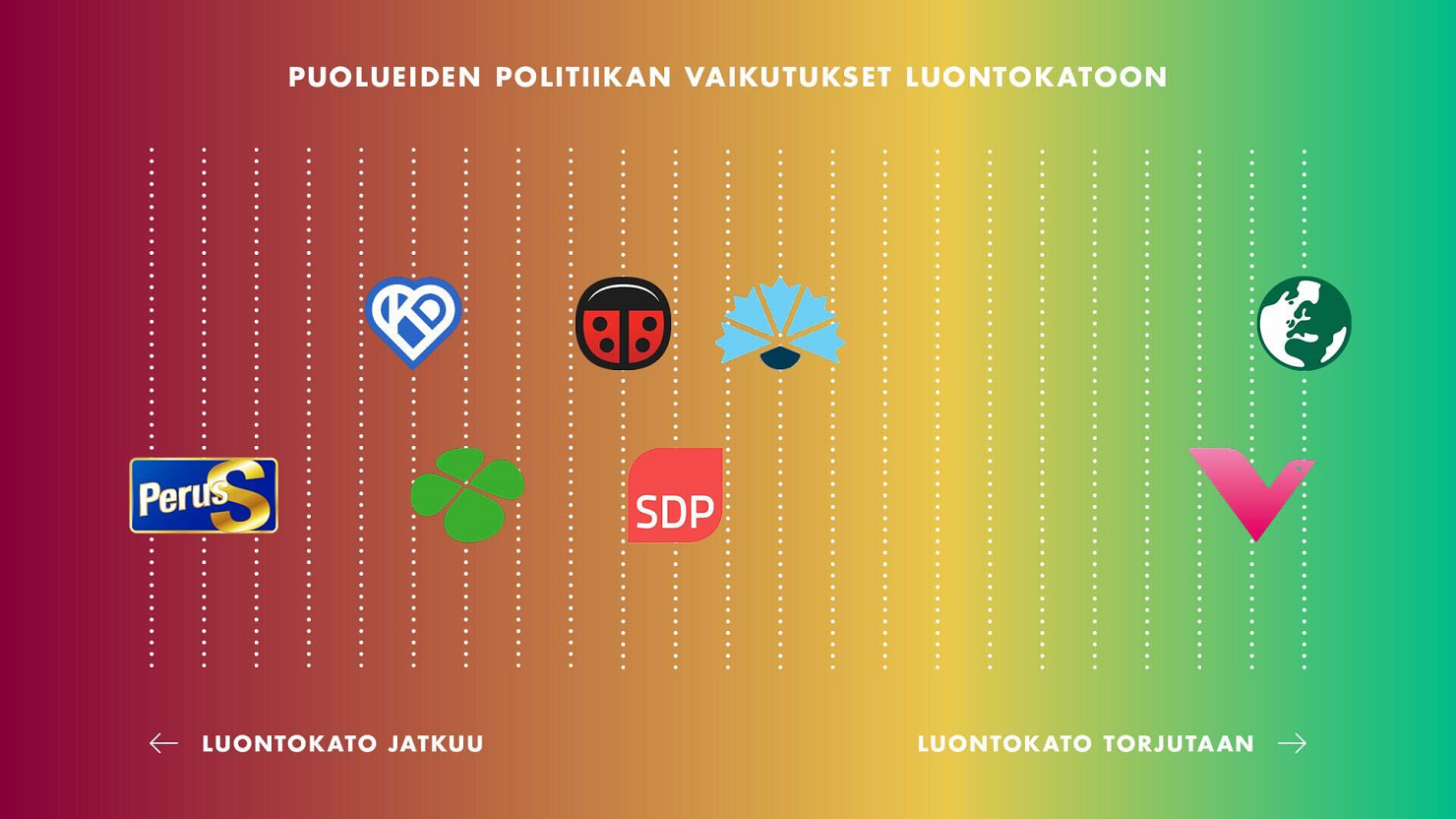Vain kahden eduskuntapuolueen toimet olisivat riittäviä luontokadon ja ilmastokriisin pysäyttämiseksi. Puolueille vaikeimpia kysymyksiä ovat riittävän rahoituksen ja suojellun pinta-alan turvaaminen. Eniten kannatusta puolueilta saavat vapaaehtoisten suojeluohjelmien tekeminen pysyviksi ja niiden rahoituksen pitäminen vähintään ennallaan sekä hiilinielujen pelastaminen.