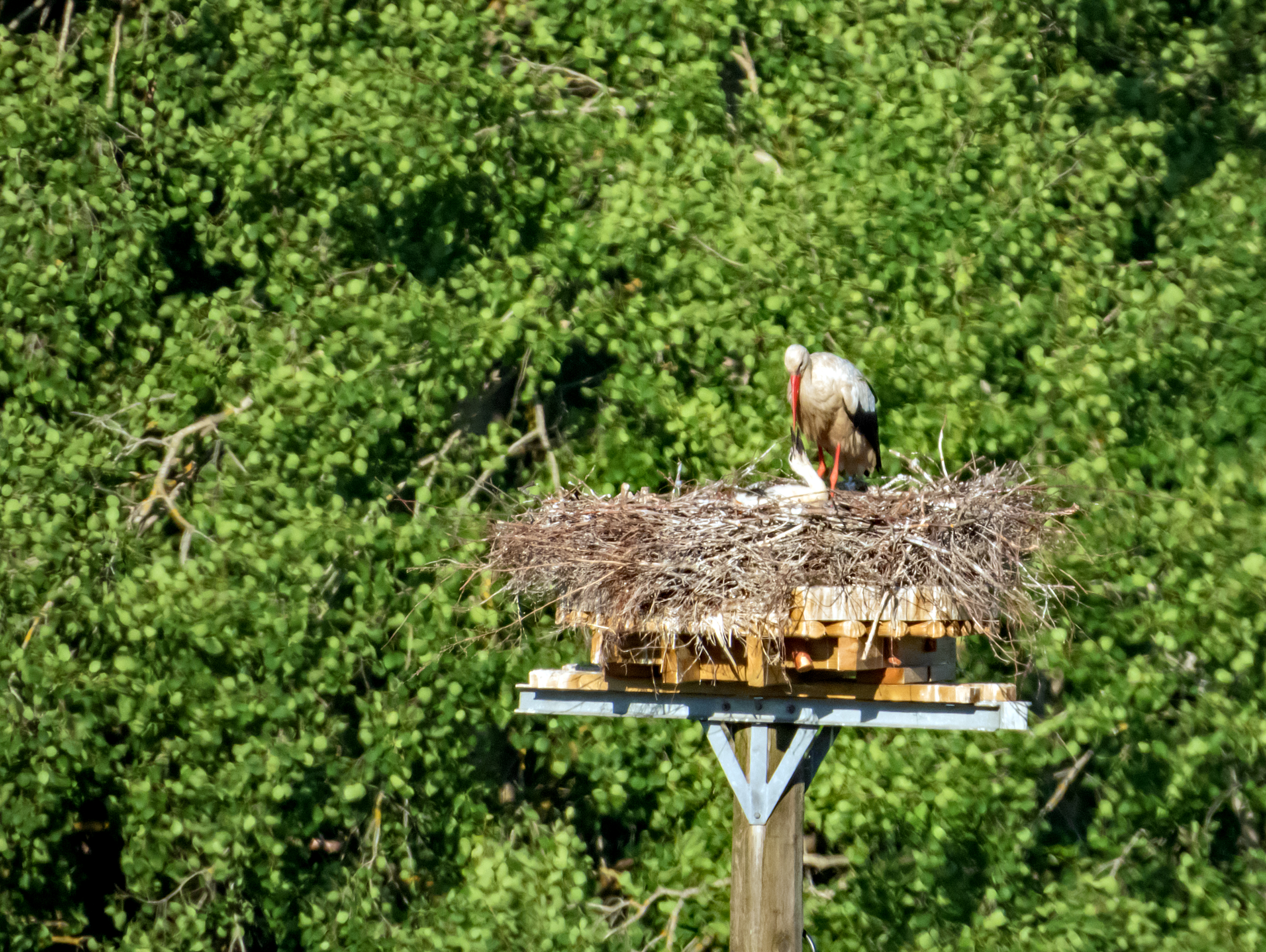 Valtakunnan silmäteräksi sittemmin noussut haikarapariskunta otti korkeaan tolpannokkaan rakennetun keinopesän nopeasti omakseen. Pari yllätettiin rakkauspuuhista pesällään huhtikuun loppupuolella, ja emo muni toukokuussa arvoitukseksi jääneen määrän munia, joista on nyt todistettavasti kuoriutunut kesäkuun alkupuolella yksi pienokainen.