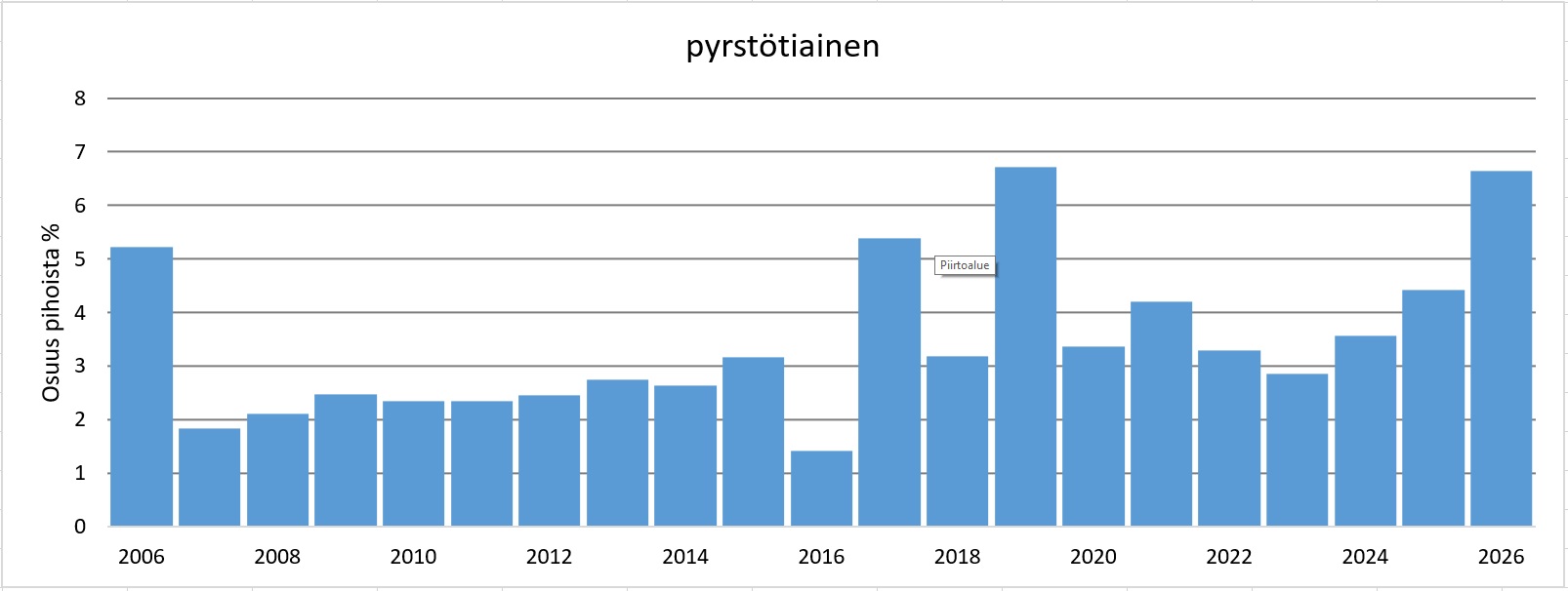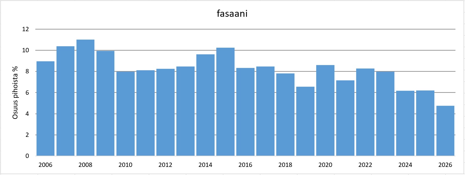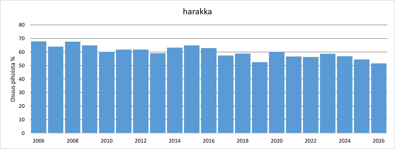 Vaikka harakoita havaittiin suunnilleen joka toisella pihalla, laji on taantunut selvästi jo vuosien ajan. Myös varis on vähentynyt. Molempia lajeja on ollut Pihabongauksessa vain kerran vähemmän kuin nyt. Entistä harvinaisempi näky pihoissa on myös fasaani. Pihabongauksen alkuvuosista se on vähentynyt alle puoleen.