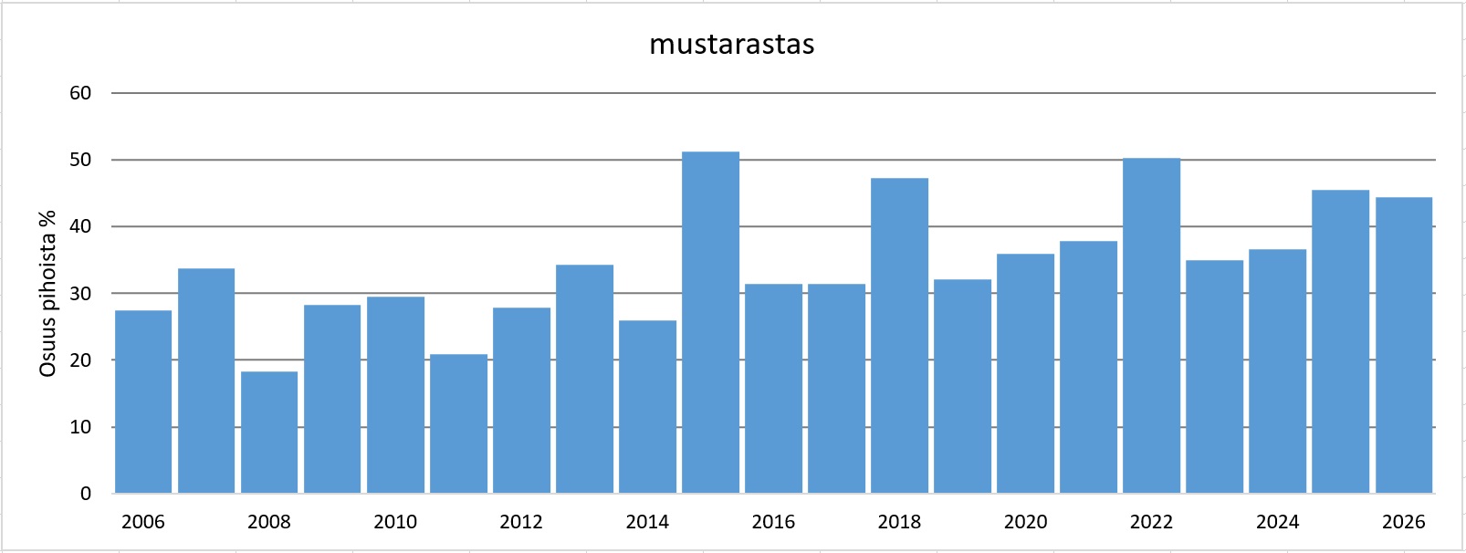 Pihlajanmarjojen puutteessa marjalintuja eli tilhiä ja räkättirastaita havaittiin odotetusti hyvin vähän. Mustarastaalla oli silti kautta aikojen toiseksi paras tulos. Leudon alkutalven ansiosta mustarastaita jäi runsaasti talvehtimaan, ja tammikuun pakkaset toivat rastaat pihoihin. Myös punarintoja on jäänyt runsaasti talvehtimaan. Vain kerran niitä on ollut Pihabongauksessa enemmän kuin nyt.